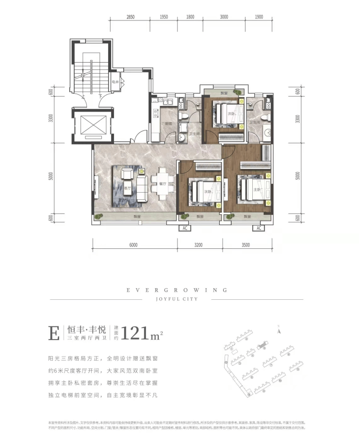 121㎡三室两厅户型,6米超大客厅开间,主卧套房独立衣帽间,双阳卧室【在售产品户户赠送飘窗】
