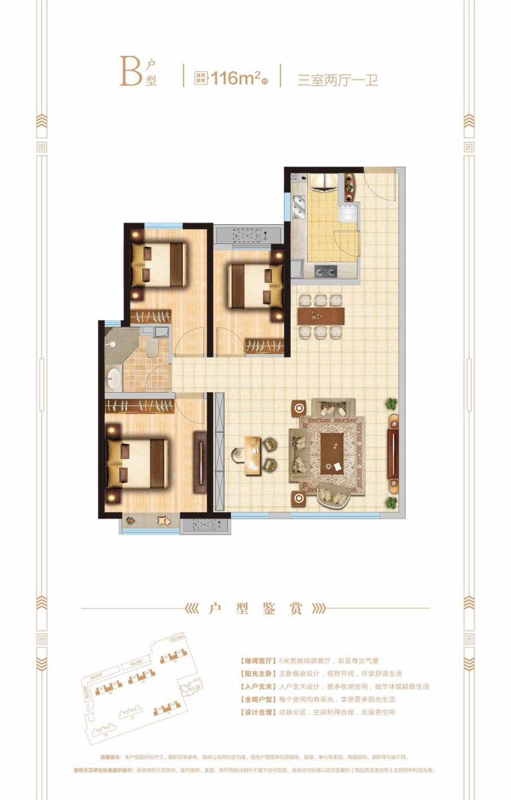 主推116㎡三室两厅一卫(客厅开间6米宽厅)