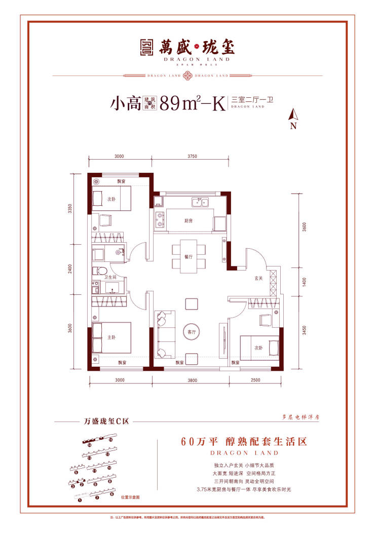 4、四大开间飘窗赠送约7.38平5、五星级居住体验,88%以上超高得房率,89平面积享105平居住感受
