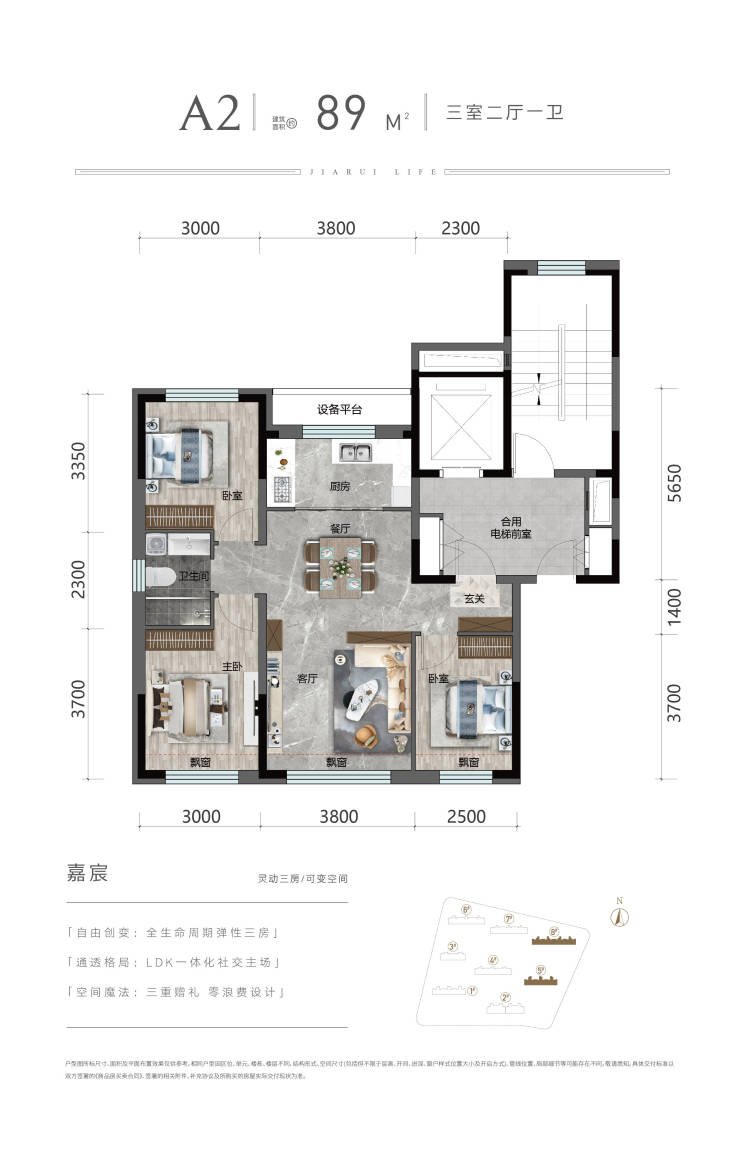 2、A2(89㎡ 三室两厅一卫):