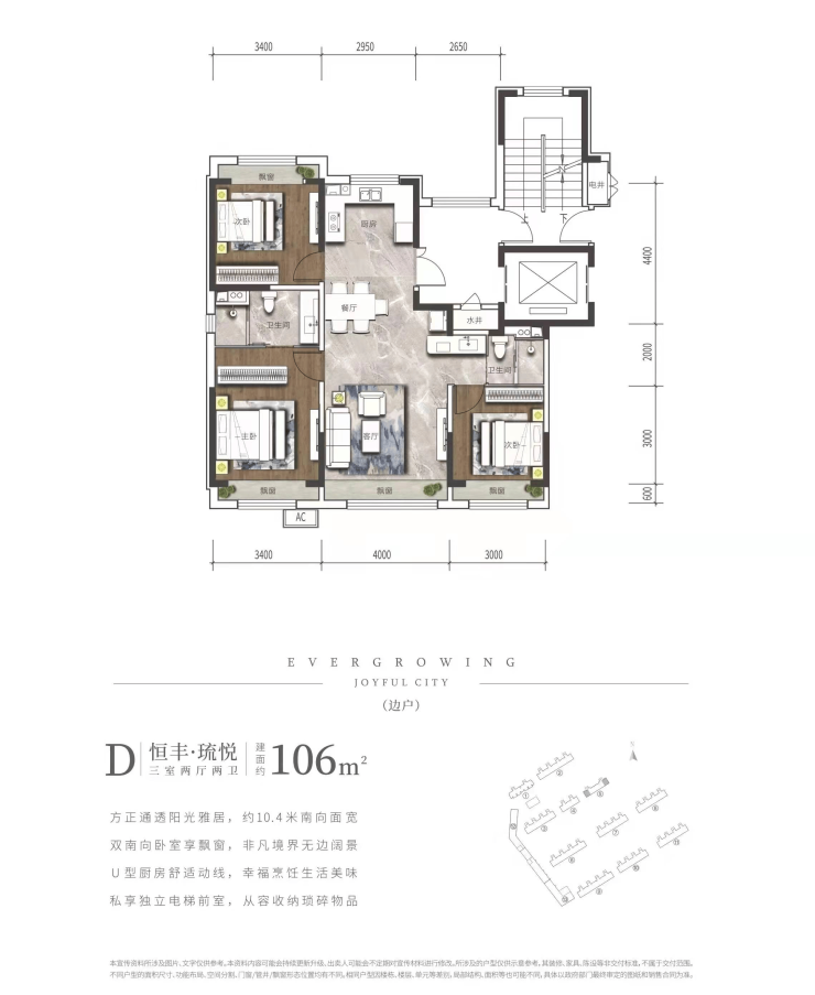 建筑面积约106㎡ 3室2厅2卫 赠送4个飘窗 赠送面积约8㎡ 约10.4米南向面宽