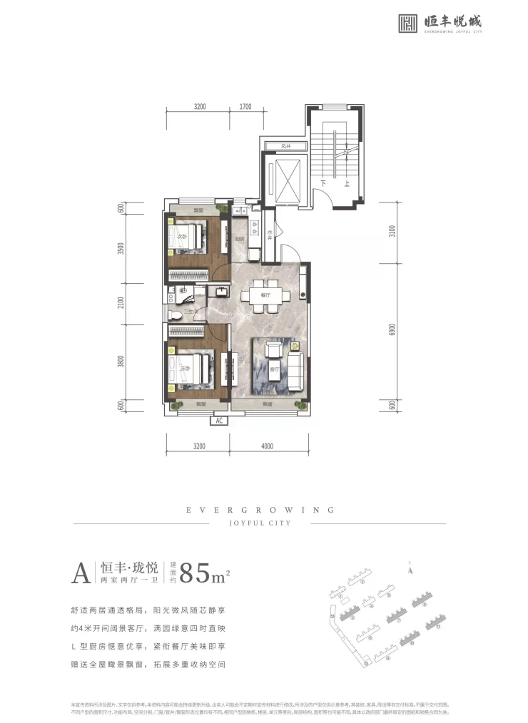 【恒丰悦城】户型图:建筑面积约83㎡ 2室2厅1卫 赠送3个飘窗 赠送面积约6平