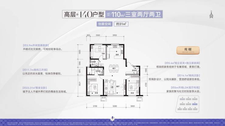 全宽厅格局:全系宽厅格局,125㎡户型可享约5.5m宽厅,同竞品135平空间尺度