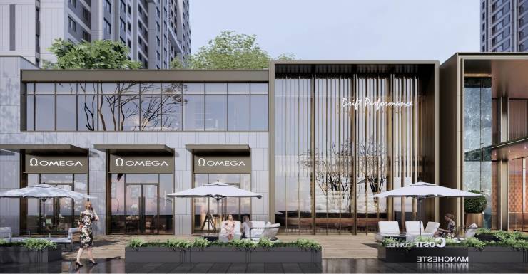 ①一进烟火前场,品质商业+酒店式公区,以香槟金铝板结合石材,高反灰玻引力橱窗,搭配普拉达绿石材,高品质烟火归家前场。