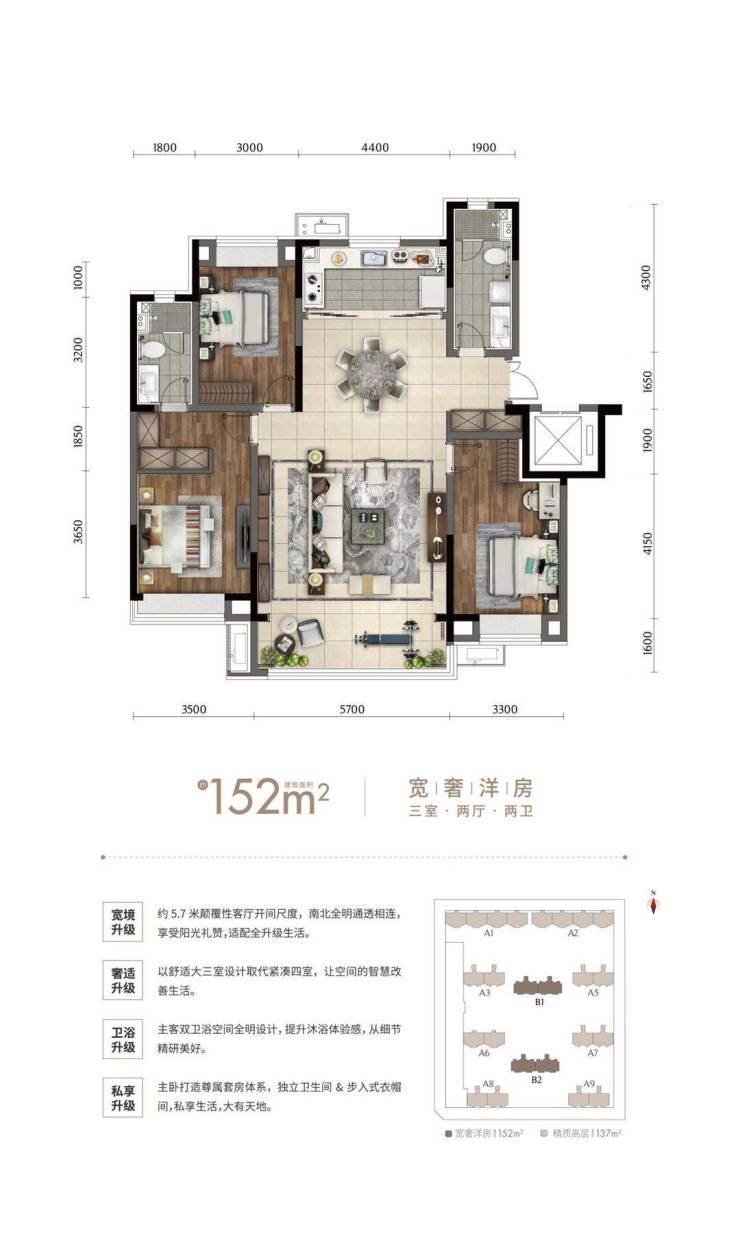 · 顺应当下改善置业潮声,园区仅两种户型纯粹规制排布· 建面约137-152㎡大三室宽平层,划定了圈层的纯粹性· 沿袭华润置地全新精装标准,打造润+品质新升级