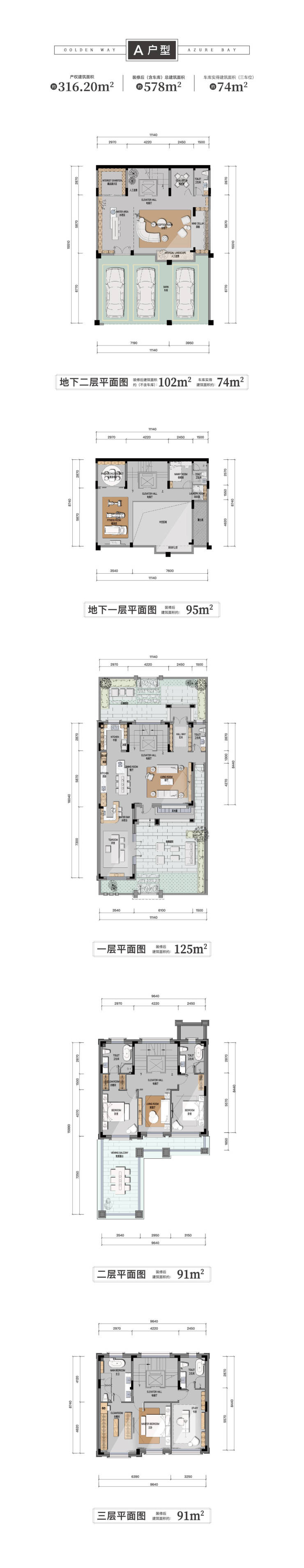 产权面积为300平到430平,分为A和B两种户型(花园120-240平)