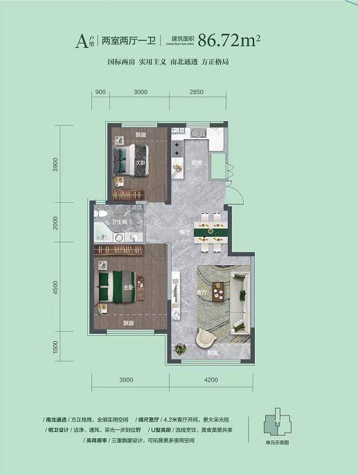 在售户型:约86.72m²两室两厅一卫