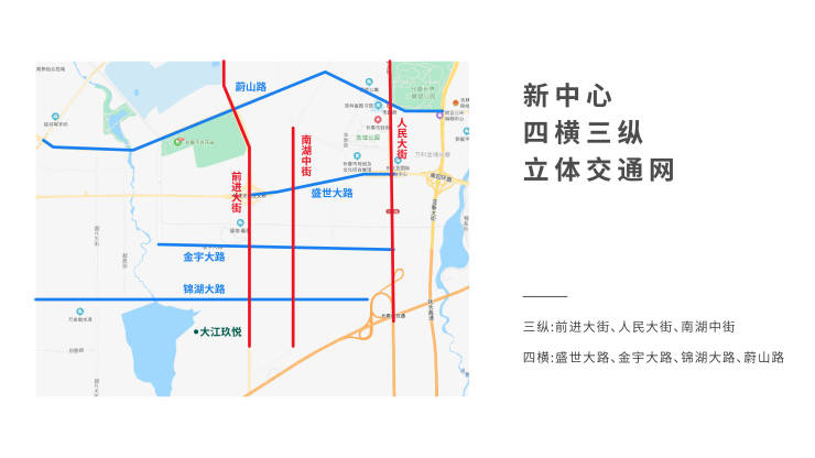 交通:三纵:前进大街、人民大街、南湖中街四横: 盛世大路、金宇大路、锦湖大路、蔚山路 交通配套:公交3 0 7 / 2 0 2 / 1 1 1 路,地铁1 号线、地铁6 号线,南部新城枢纽站
