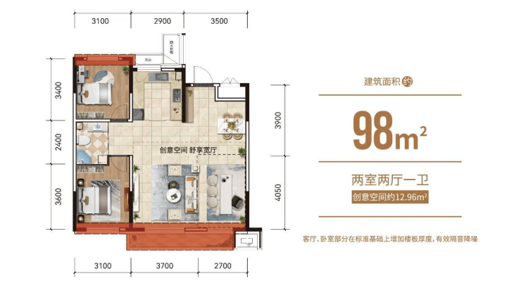 98㎡三室两厅一卫(客厅开间3.7米,两个南向卧室分别3.1米、2.7米)厨房U型设计,赠送面积约"13"平