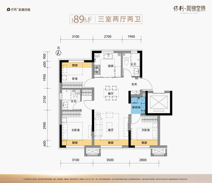 建面89㎡三室两厅两卫,一梯两户,+赠送7㎡:216套