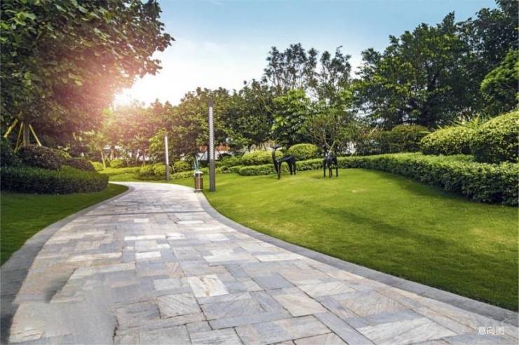 两轴:横轴——中央会客超级主轴,设林下会客空间,以景观营造完美归家体验;纵轴——超长自然呼吸观林绿廊,树木根据季节富于变化,形成会呼吸的漫步生态道路