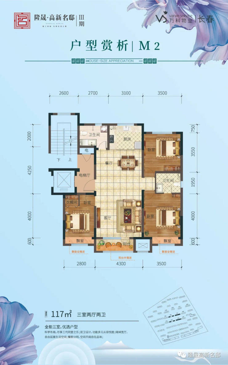 3.户户有赠送,赠送南向飘窗+半赠送全明落地大阳台,117㎡/130㎡洋房赠送电梯前室,一楼赠送花园,顶层赠送客厅5.7米挑空;