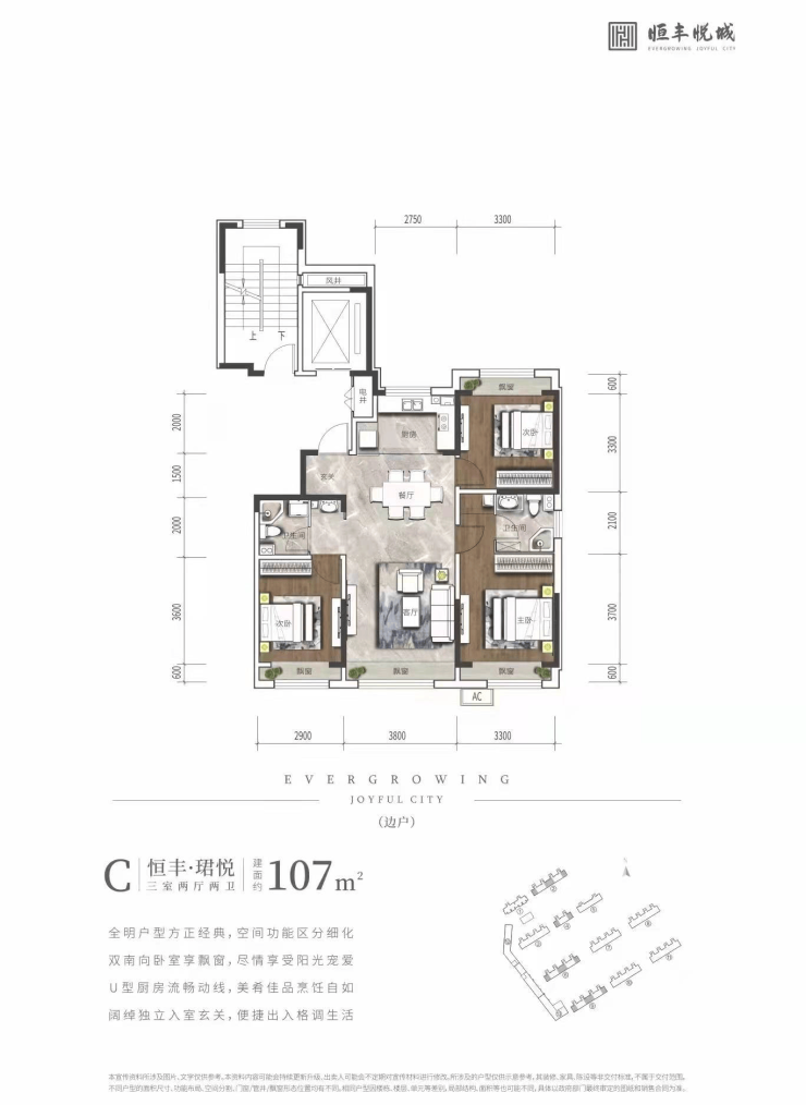 建筑面积约107㎡3室2厅2卫 赠送4个飘窗 赠送面积约8㎡