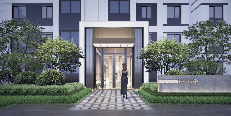 ①一进烟火前场,品质商业+酒店式公区,以香槟金铝板结合石材,高反灰玻引力橱窗,搭配普拉达绿石材,高品质烟火归家前场。