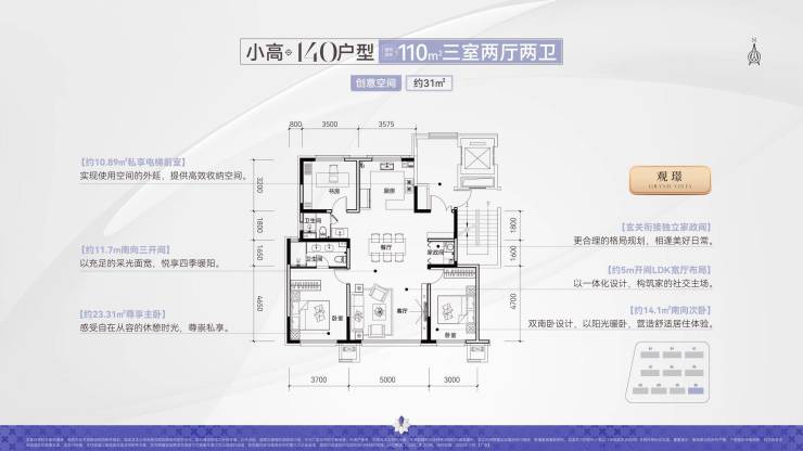 3、全宽厅格局:全系宽厅格局,125㎡户型可享约5.5m宽厅,同竞品135平空间尺度
