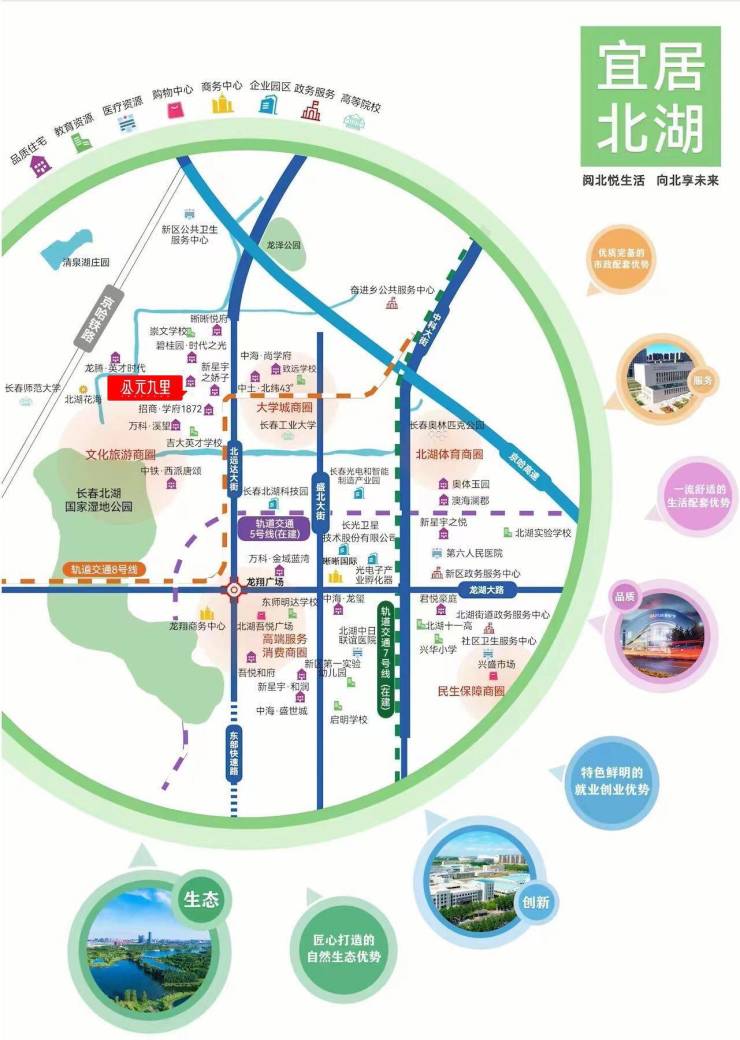 国家4A级景区-北湖公园,吾悦广场,中日联北湖分院以及轻轨8号线, 目前长春的热点区域,房子无论从居住还是后期溢价能力都远高于其他区域;项目的西侧就是北湖湿地公园,这也是华润重仓北湖的核心原因;整个区域的配套也是十分齐全的。